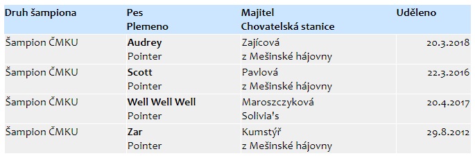 V necelých 3 letech si splnila podmínky pro získání titulu Šampiona ČMKU a stala se teprve 4. pointrem, který tento titul v ČR získal a jedinou fenou. Jedním ze psů s tímto šampionátem je její otec Scott z Mešinské hájovny :)
